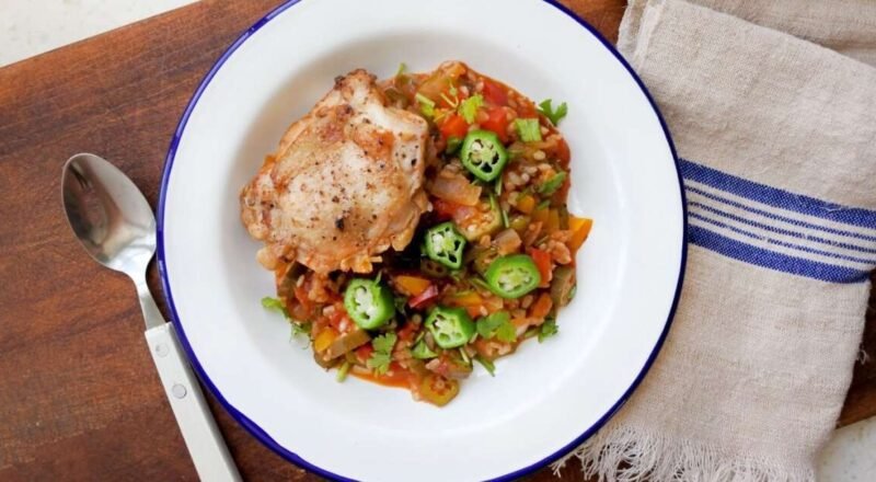 Em um recipiente, tempere as sobrecoxas com sal, pimenta-do-reino e suco de limão. Deixe descansar por pelo menos 20 minutos. Em uma panela grande, aqueça o óleo em fogo médio e doure bem os pedaços de frango. Retire e reserve. Na mesma panela, refogue a cebola e o alho até dourar. Acrescente o pimentão e o tomate e deixe cozinhar até formar um molho. Adicione o arroz, misture bem e acrescente a água quente. Coloque as sobrecoxas de frango novamente na panela, tampe e deixe cozinhar em fogo médio até o arroz ficar quase pronto. Quando o arroz estiver quase cozido, adicione o quiabo. Misture levemente, tampe a panela e cozinhe por mais 5 minutos. Desligue o fogo, polvilhe cheiro-verde e sirva em seguida.