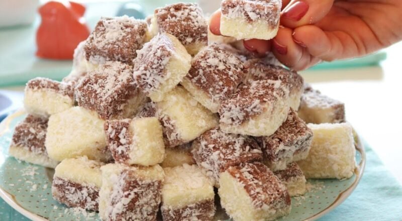 - Após o tempo de geladeira, retire, solte as laterais com uma faca e corte em quadradinhos. Empane-os no coco ralado.